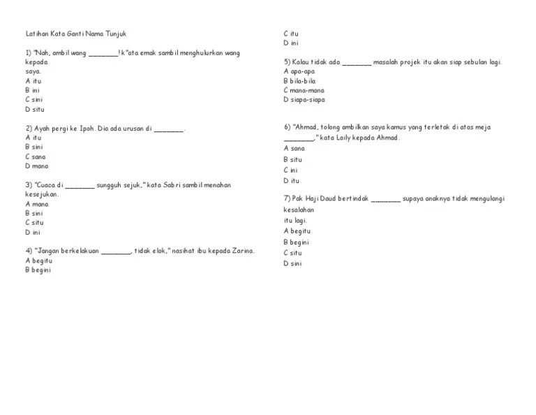 Sri akademik bm pemahaman tahun 4 5 6 upsr facebook. Menunjukkan tempat yang tidak begitu jauh. Isi tempat kosong dengan perkataan yang paling sesuai. Latihan kata ganti nama diri dan tunjuk. Latihan tatabahasa tahun4 kssr buku teks ms 23 . Latih tubi kata ganti nama.